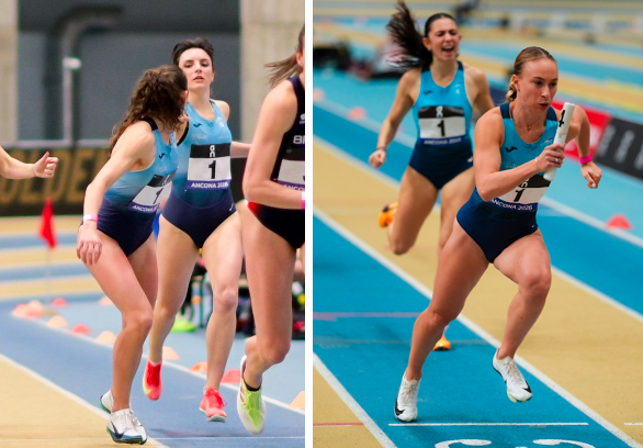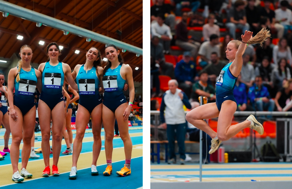 La staffetta 4x2giri composta da Sophia Favalli, Silvia Meletto, Almici Alexandra e Benedetta Falleti, argento agli Assoluti indoor. A destra un salto di Veronica Crida, quarta classificata (foto Grana/Fidal)
