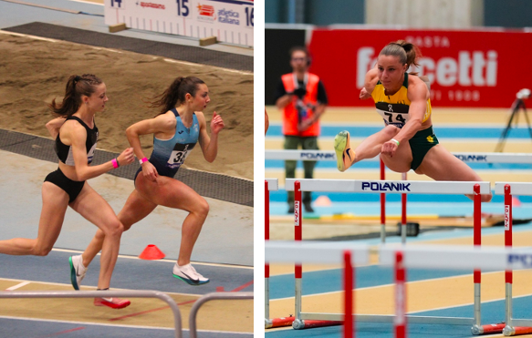 Alexandra Almici (a sinistra) alla partenza degli 800 metri e (a destra) Elena Carraro, la migliore delle nostre atlete condivisa, quarta nei 60 ostacoli (foto Grana/Fidal)